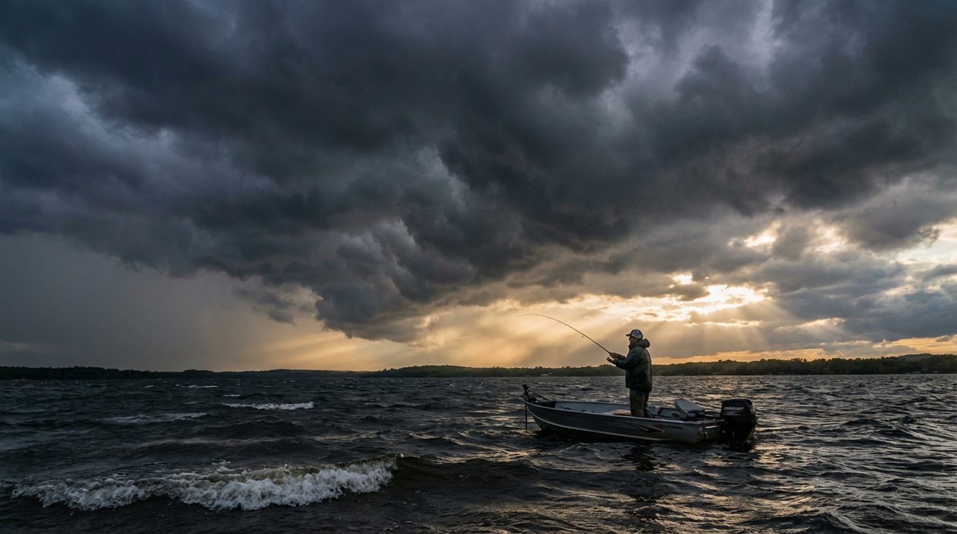 Why bass bite now: When barometric pressure drops rapidly — typically falling from above 30.10 inHg toward 29.80 inHg or lower — bass go on an aggressive feed. Scientists believe the pressure change affects their swim bladder, creating discomfort that drives fish to eat heavily before conditions deteriorate. The overcast skies and wind that come with a low-pressure system also reduce light penetration, giving bass a predatory advantage.