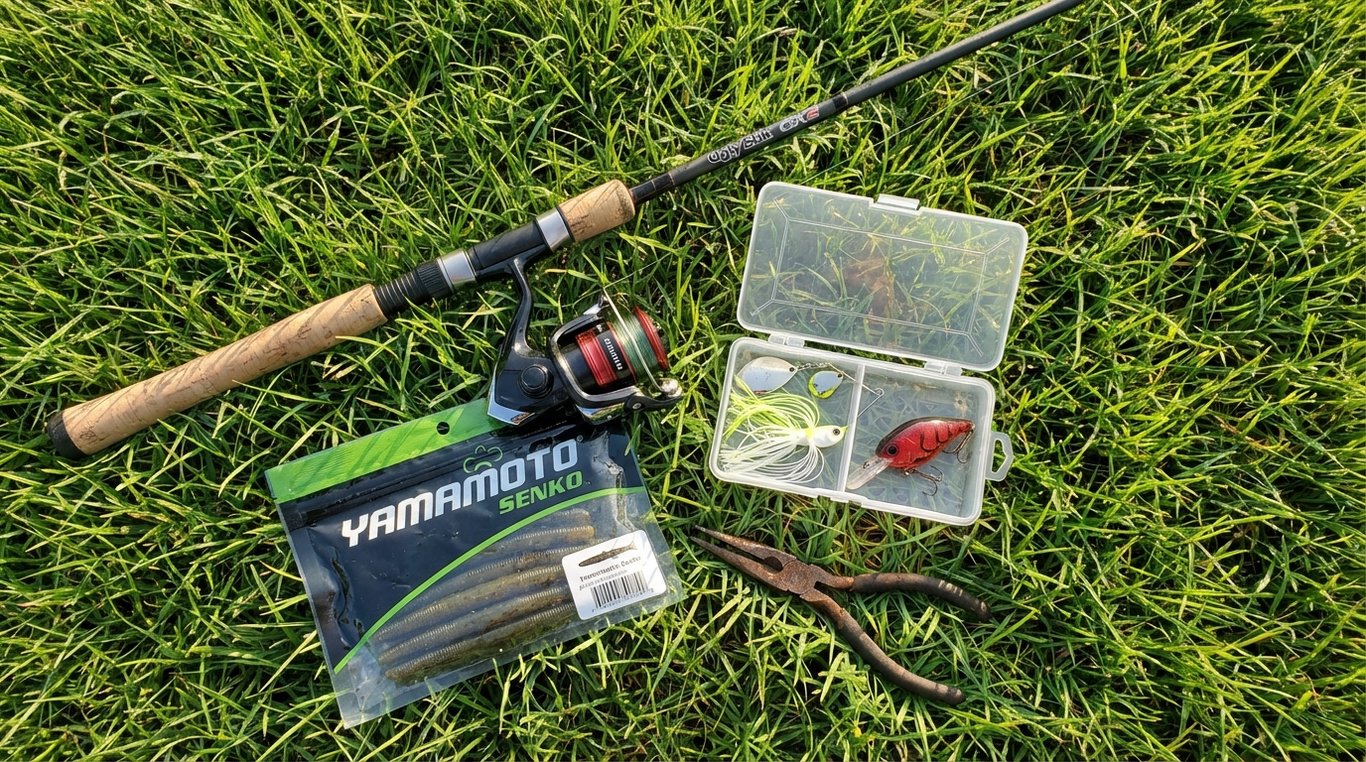 You need a spinning rod and reel combo (6'6" to 7' medium power), 10-pound monofilament line, a few soft plastic Senko worms, a pack of wacky rig hooks (size 1/0), needle-nose pliers, and a valid fishing license for your state. You can get started for under a hundred dollars.