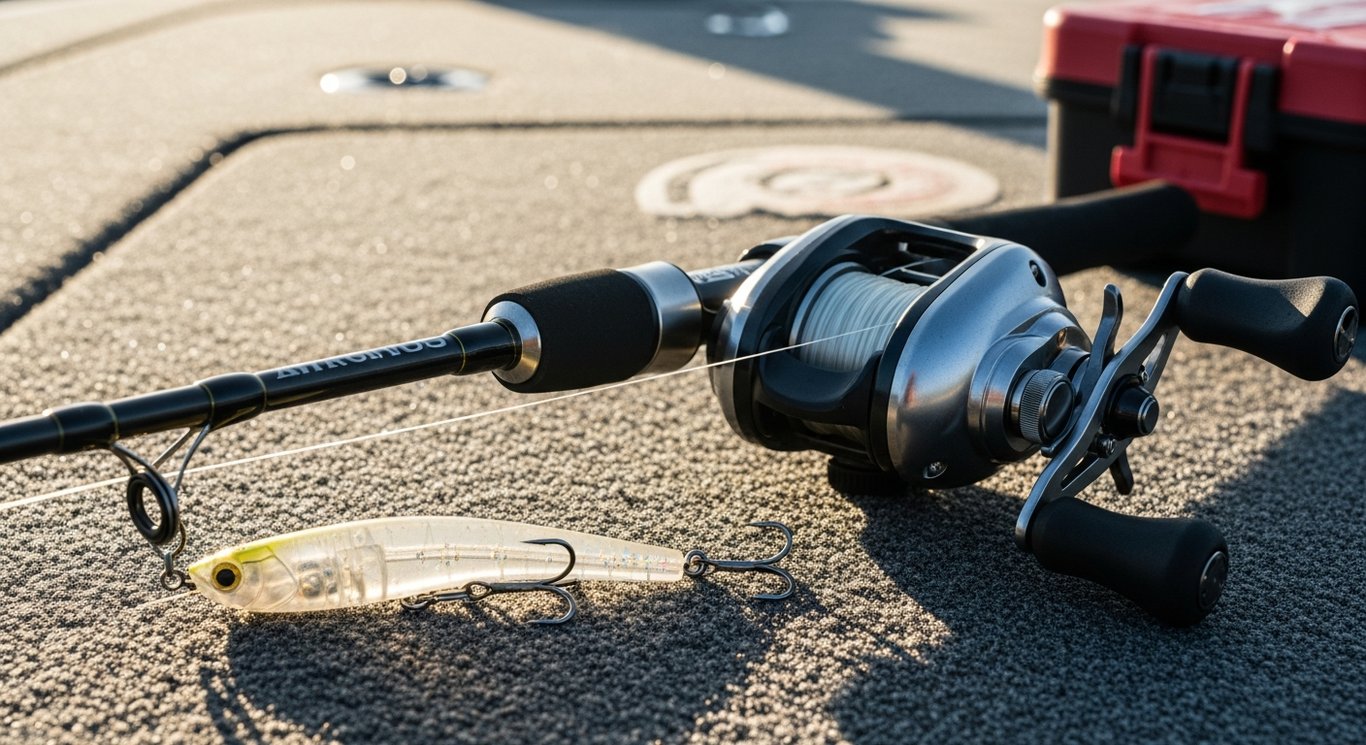 Reel: A 6.3:1 to 6.8:1 gear ratio baitcaster works best. You are not reeling much — just picking up slack between jerks. A slower gear ratio keeps you from over-retrieving the bait.