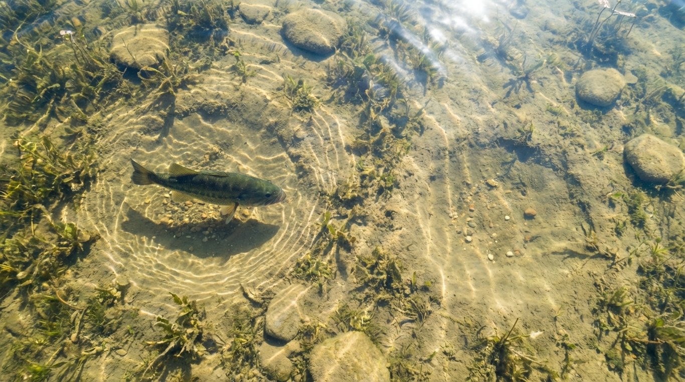 Not all bass spawn at once. Males move up first to build beds, usually in 1 to 4 feet of water. Females cruise nearby in slightly deeper water until conditions feel right, then move in to drop eggs. The entire spawn can stretch across three to six weeks on any given lake.