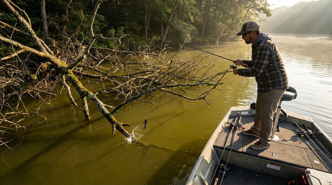 Setup: Rig a 3/8-ounce tungsten bullet weight pegged to a 4/0 Gamakatsu EWG hook on 20-pound fluorocarbon. Thread on a Zoom Brush Hog or Strike King Rage Bug. Flip it into every gap, pocket, and shadow you can find. Let it fall on a semi-slack line, watch for the tick, and set the hook hard. A 7'3" heavy-action rod gives you the backbone to horse fish out of the wood.